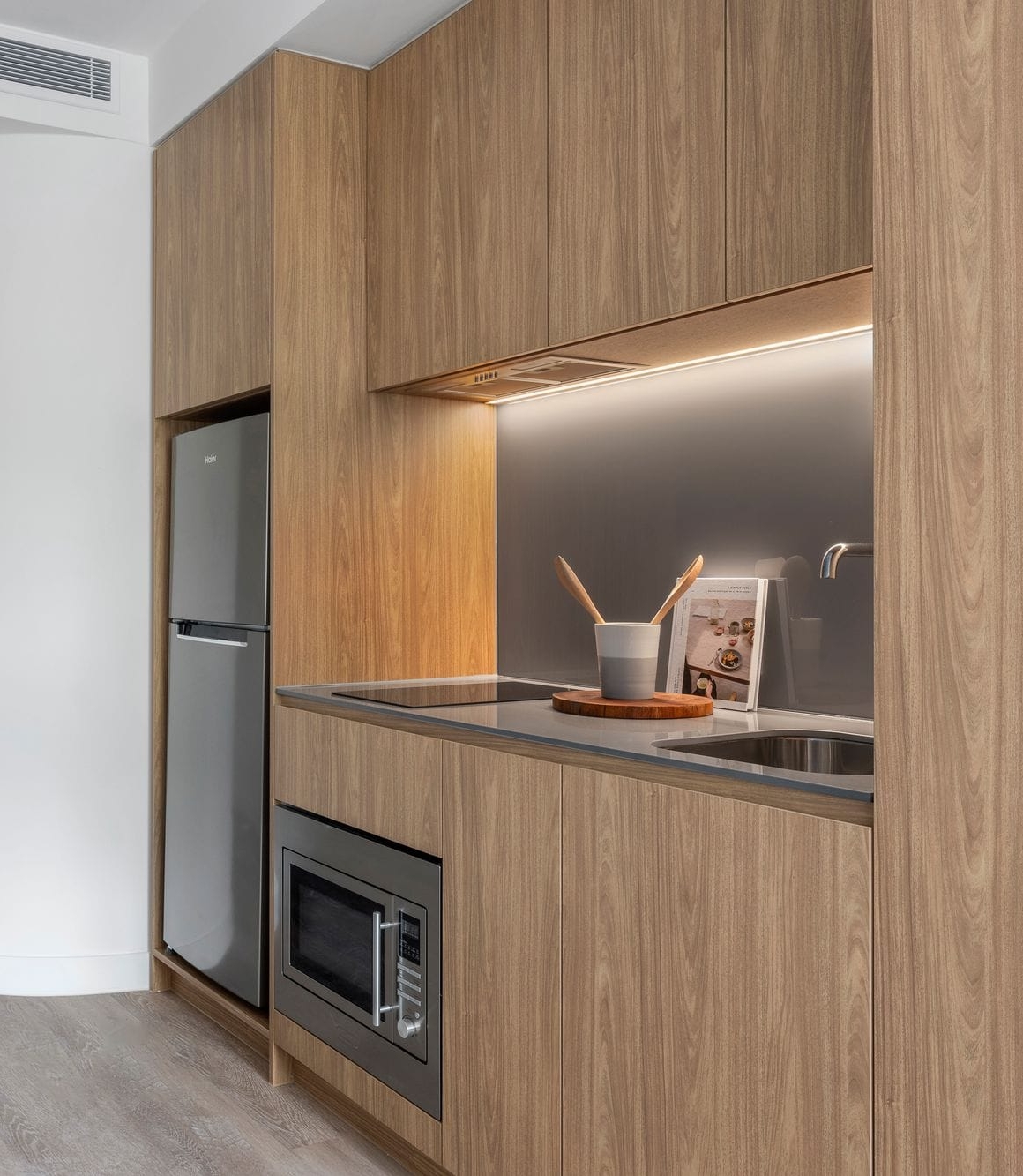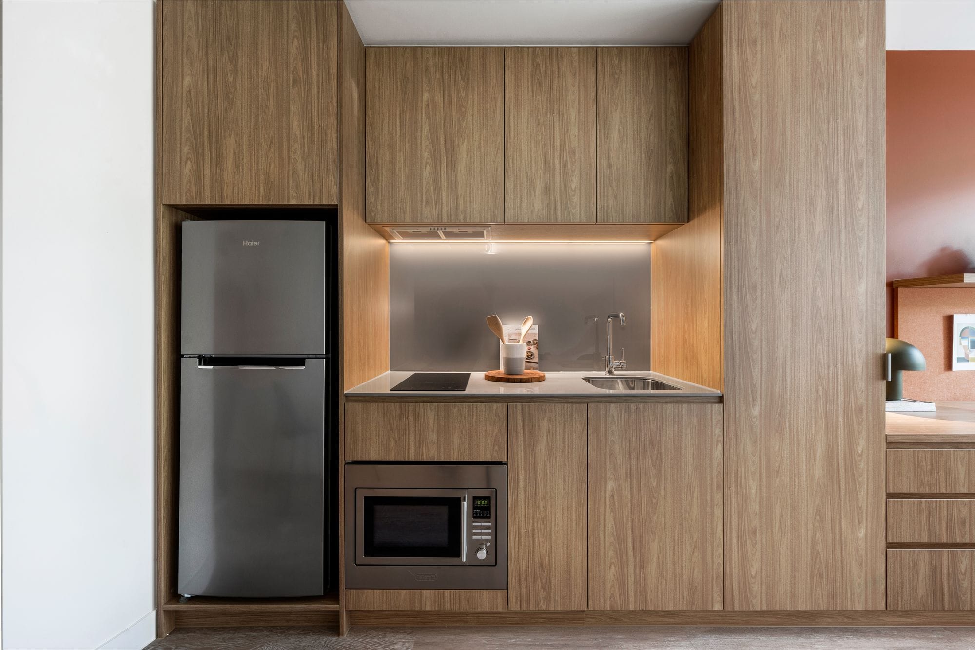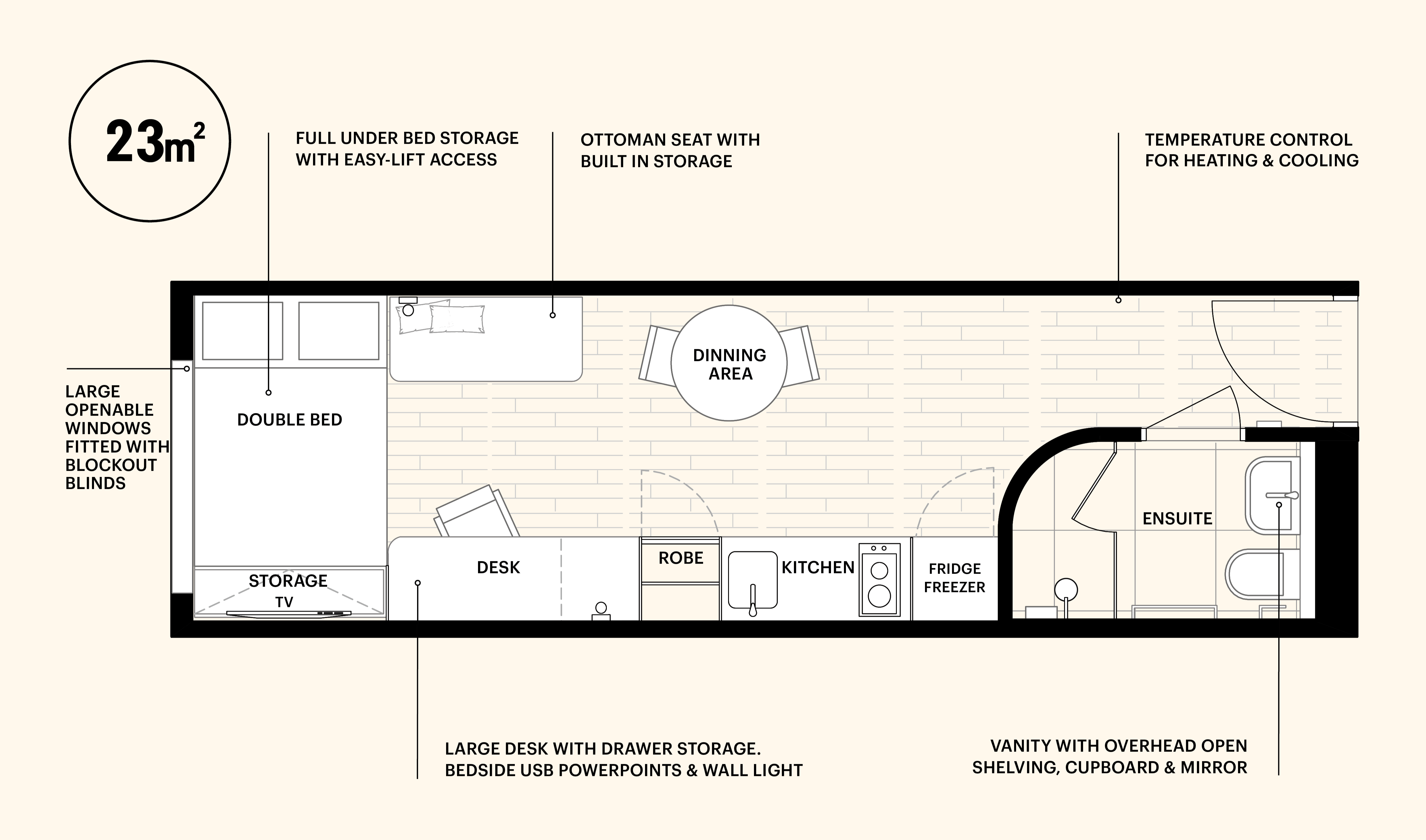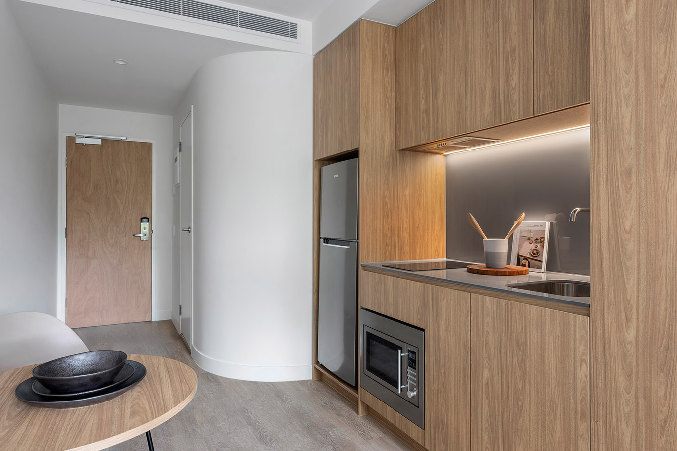 The Large Studio offers even more room. Enjoy the luxury of a double bed, plus your own stylish kitchen with modern appliances and ensuite bathroom. It also includes desk area, table & chairs, TV, extra storage, unlimited Wifi and air conditioning.
